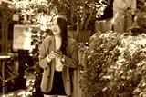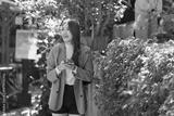Young asian businesswoman wearing a stylish purple jacket, smiling while using her smartphone in a vibrant city park, enjoying the warm sunshine and surrounding greenery