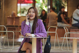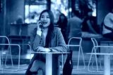 Young asian businesswoman is happily talking on her smartphone while sitting at a table in an outdoor cafe, enjoying a break and staying connected