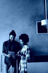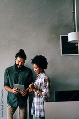 Diverse group of happy employees analyzing reports with digital device, working together in office