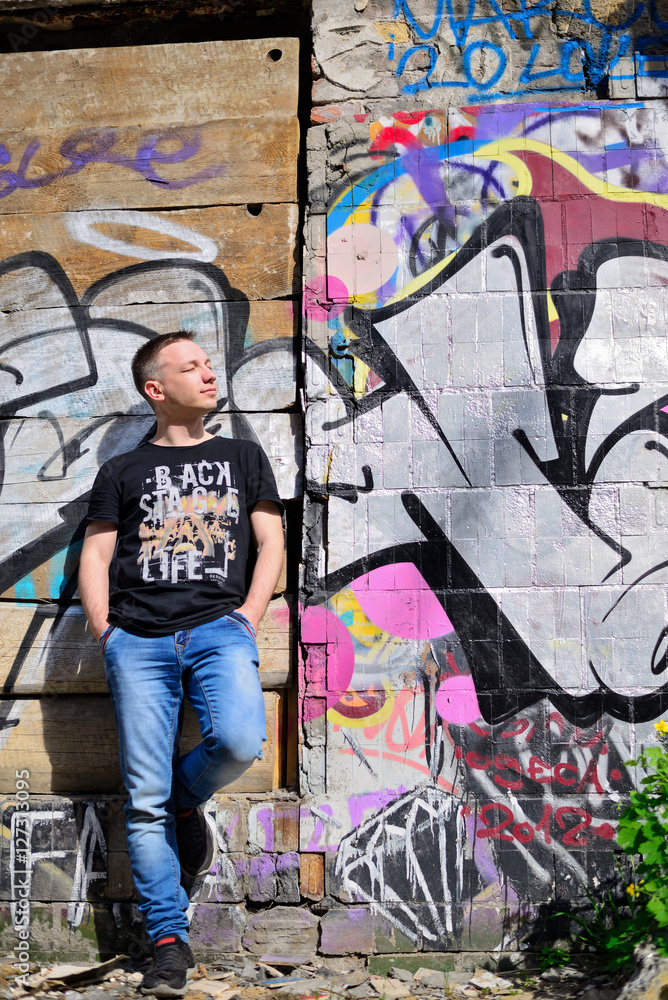 Man leans on wall with graffiti