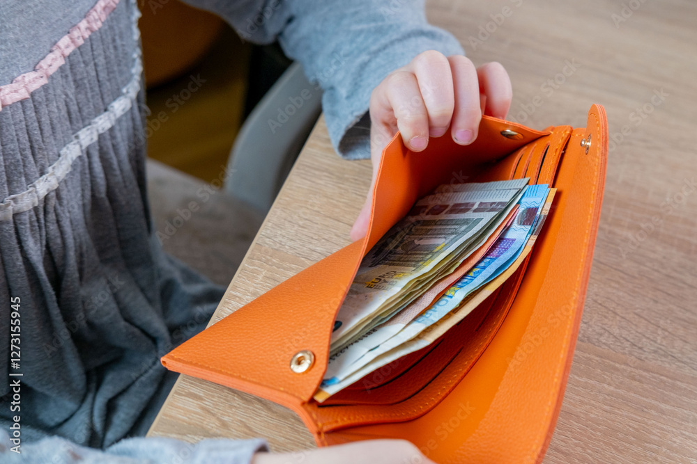 Child opening wallet full euro banknotes money on wooden table, finances, savings, and early financial awareness, Childhood curiosity, money management