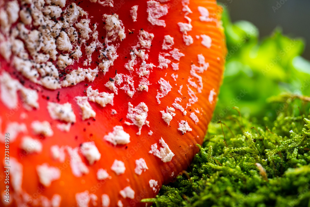 Amanita muscaria mushroom, red cap fly agaric mushroom with white spots in forest setting, natural hallucinogen, toxic wild nature