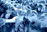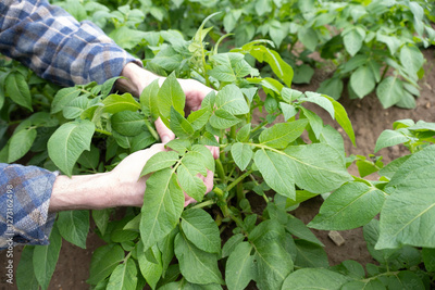 farmer checking quality potato crop, plant health green potato tops, tuberous herbaceous plant, Solánum tuberósum, agricultural scene, agricultural land, farm life
