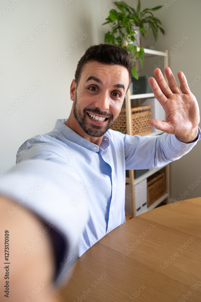Vertical selfie picture of man at home office - camera point of view.