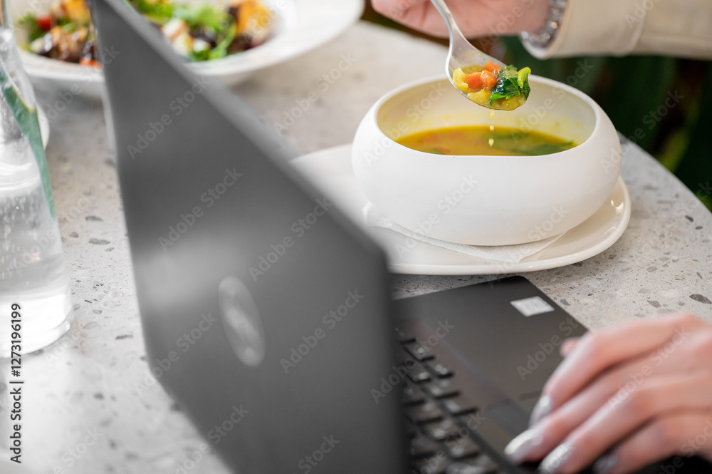 person enjoys a bowl of soup while working on a laptop. The setting features a modern table with a plate of salad in the background, highlighting a blend of work and dining