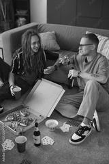 Two friends sitting casually on floor, enjoying slices of pizza and beverages while playing card game. Pizza box open with two bottles and cups visible