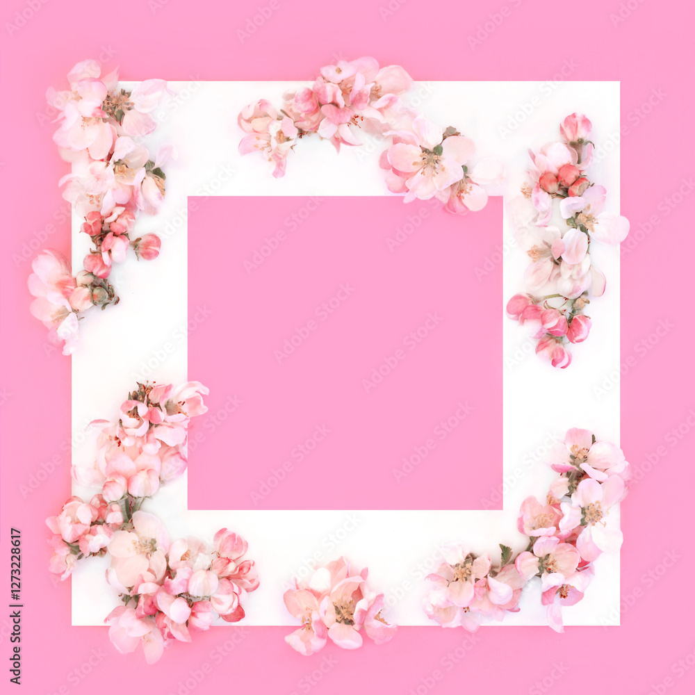 Apple blossom spring flower background arrangement with white frame on pink background. Celebration of new beginnings of nature for Easter Beltane Springtime