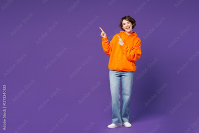 Full body young smiling cheerful fun cool happy woman wear orange hoody casual clothes point index finger aside on area mockup isolated on plain purple background studio portrait. Lifestyle concept.