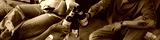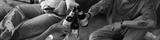 Friends sitting together, playing cards and raising beer bottles for toast during leisure activity. Close-knit gathering characterized by tattoos, casual attire and bonding moments