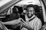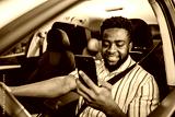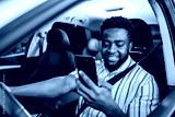 Irresponsible multicultural driver is smiling and typing messages while driving a car.