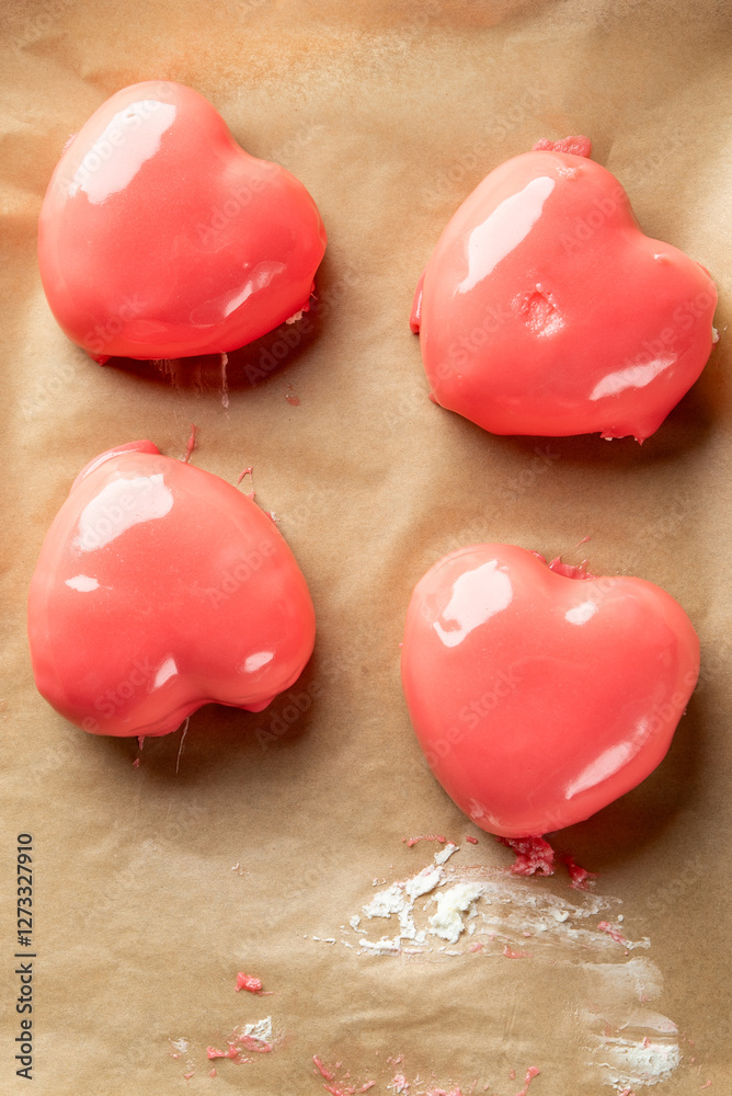 Four heart-shaped desserts with a glossy pink glaze sit on a sheet of brown parchment paper, creating a delightful and romantic presentation.