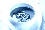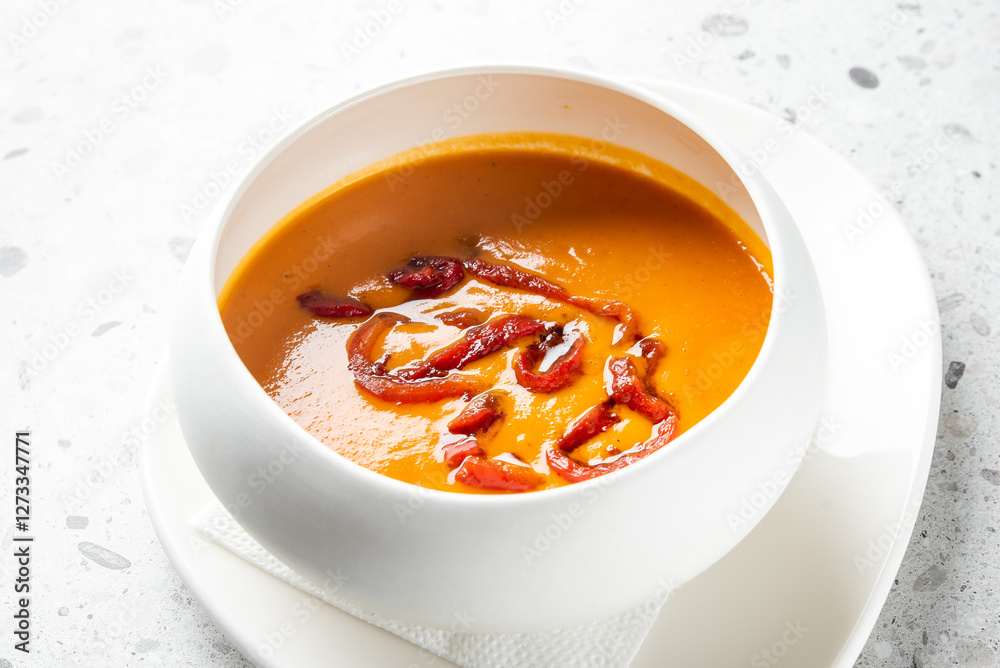 A creamy orange soup served in a modern white bowl, garnished with strips of red bell pepper. The dish is placed on a light-colored stone surface, creating a clean, vibrant look