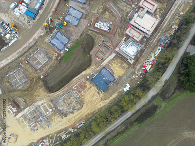 High level drone top down view of a rural housing development in Essex, UK. Underfloor heating coils can be seen in the house foundations.