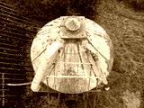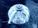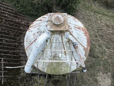 Drone inspection of an old and rusted grain feed silo located on a British dairy farm. Part of the access ladder can be seen.