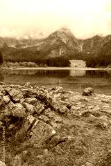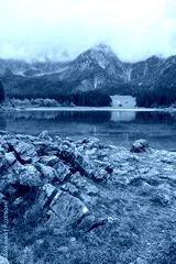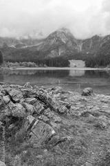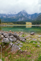 Beautiful Lago di Fusine the mountain lake and Mangart mountain