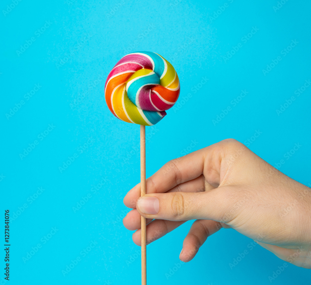 Color lollipop, spiral candy on stick, colorful striped lollypop, round fruit caramel, circle lollipop