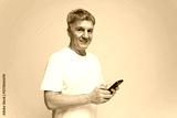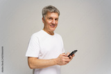 Older man in white t-shirt happily using smartphone in a neutral studio setting