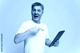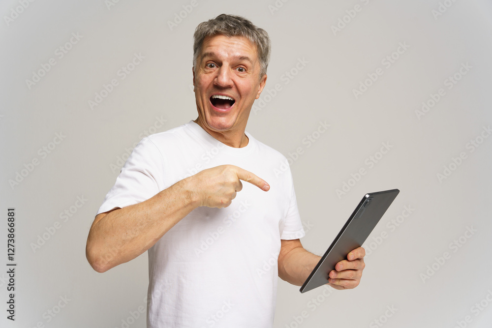 Excited man shows off tablet while smiling in a studio with neutral background