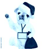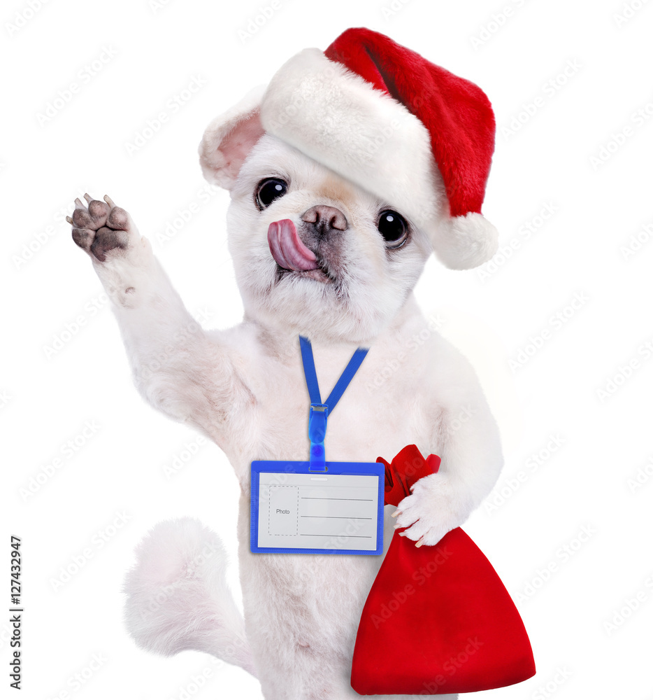 Dog in red Christmas hat wear blank white badge mockup . Isolated on the white.