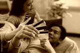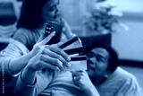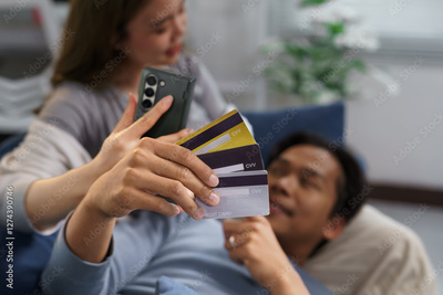 Couple relaxing on sofa using smartphone and credit cards for online shopping