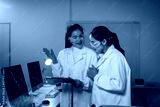 Two young female scientists discussing data in modern laboratory