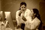 Scientists analyzing test tube with blue liquid in modern laboratory
