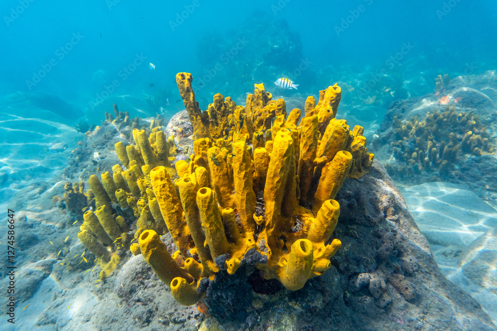 A vibrant group of yellow tube sponges growing underwater on a coral reef in the clear waters of Saint Lucia.