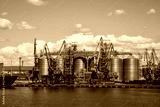 Cranes and silos are actively being constructed at a busy shipping port as ships await their cargo under a sunny sky
