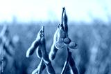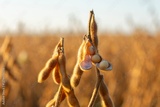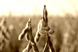 Close-up of soybean pods bursting open, revealing shiny seeds, in a vast field under the warm glow of the autumn sun.