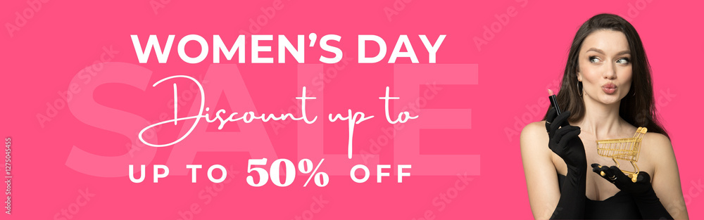 8 March, international women's day, elegant woman in black gloves, with lipstick and a small cart in her hands on a pink background, with text