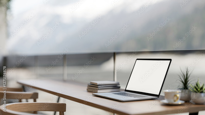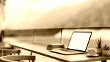 A laptop on the wooden table in the coffee shop, the sitting spot beside glass partition.