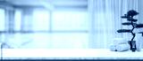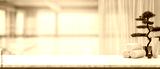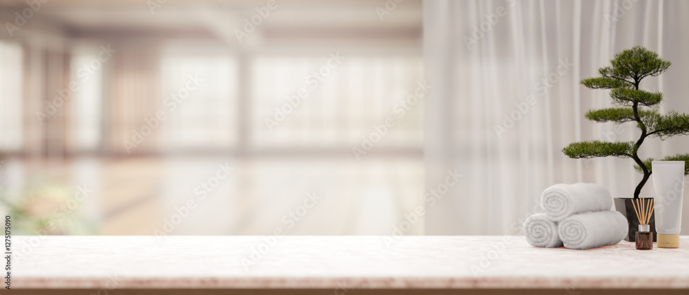 the white marble table with spa essentials and bonsai pot with blurry background of bright room.