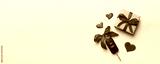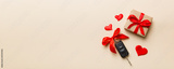 Black car key in a present box with a ribbon and red heart on colored background. Valentine day composition Top view