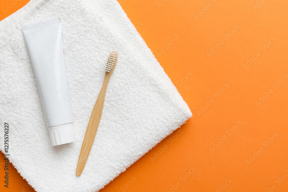 toothpaste and toothbrush top view with copy space on colored background. Flat lay. Dental hygiene. Oral care products on light background. Body care concept