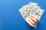 Closeup model of a human jaw with white teeth and dollar bill. Dentistry conceptual photo. Prosthetic dentistry. False teet top view with copy space