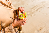 Woman holding a glass with tropical sliced fruits at beach