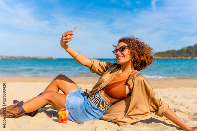 Sensual arab modern woman taking selfie sunbathing on the beach