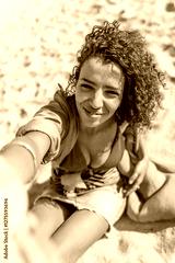 Arab young woman in summer clothes taking selfie on beach