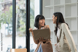 Two young businesswomen celebrating a successful project in a modern office, joyfully holding a laptop and showcasing teamwork, accomplishment, and excitement in their professional environment