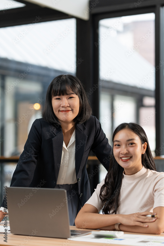 Two smiling asian businesswomen are working together in a modern office, using a laptop and analyzing graphs, showcasing teamwork and expertise