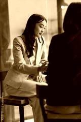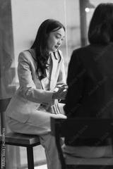 Two asian businesswomen are sitting on chairs in a cafe inside their office building, discussing marketing strategy and having a productive meeting