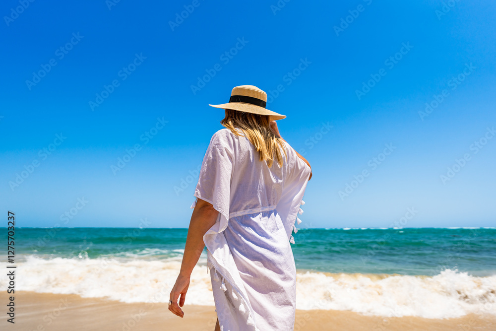 Beautiful mature woman walking on sunny sandy paradise beach on Armona island in Portugal. Travel destination - Armona beach. Back view