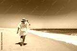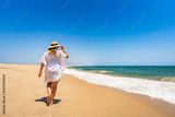 Beautiful mature woman walking on sunny sandy paradise beach on Armona island in Portugal. Travel destination - Armona beach. Back view