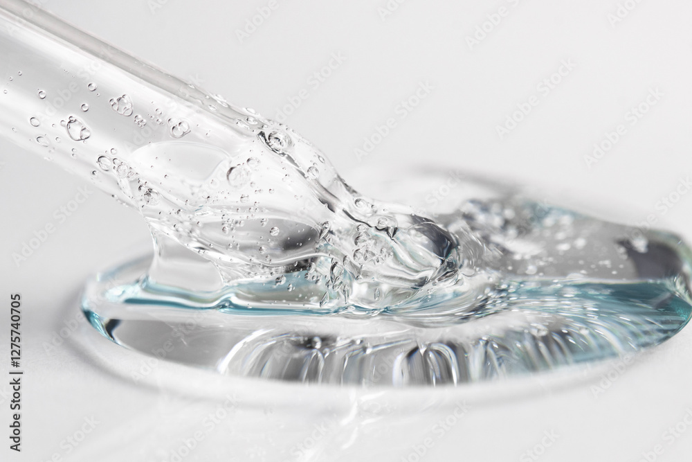 Transparent cosmetic texture with bubbles on gray background front view. Hair and face gel with pipette.