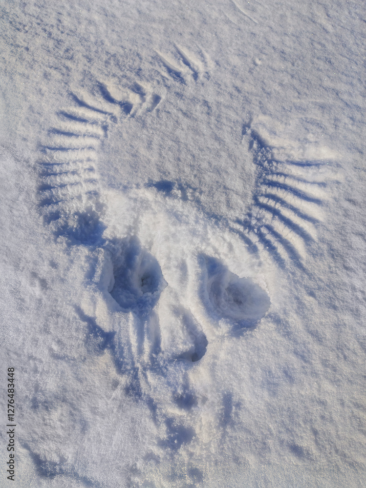 Snow imprint of a flying bird, reminiscent of a goat or demon skull.