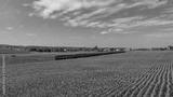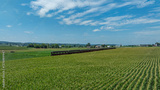 A vintage train travels through expansive green fields under a bright blue sky. Farms and distant hills provide a picturesque backdrop, showcasing the beauty of rural life.