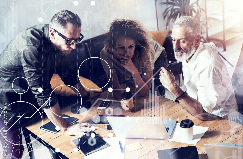 Concept of digital screen,virtual connection icon,diagram,graph interfaces. Business people brainstorming photo.Bearded man talking with account director and creative manager.Horizontal,blurred.