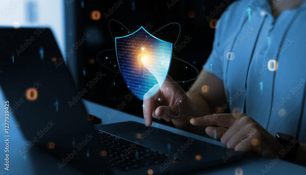 Person using laptop with digital padlock shield.Cyber security protection concept.Data protection concept.Protecting herself from cyber attacks and personal data.Cyber security network.