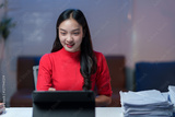 Young professional woman in a red blouse focuses on a digital tablet at her desk, surrounded by stacks of documents, in a modern office setting with soft lighting