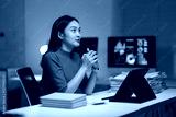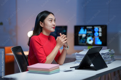 Focused businesswoman in a modern office environment analyzing data on a tablet. Two screens display charts and graphs, indicating a data-driven work session. Stacks of documents surround her